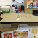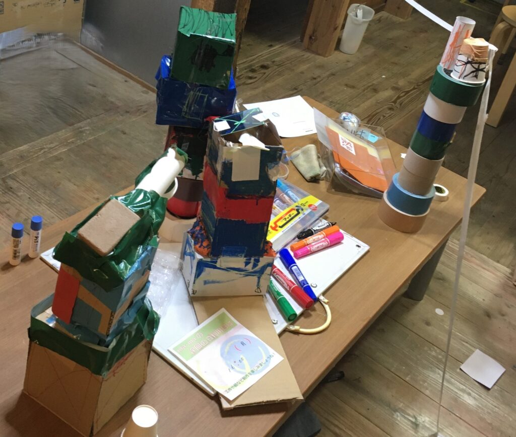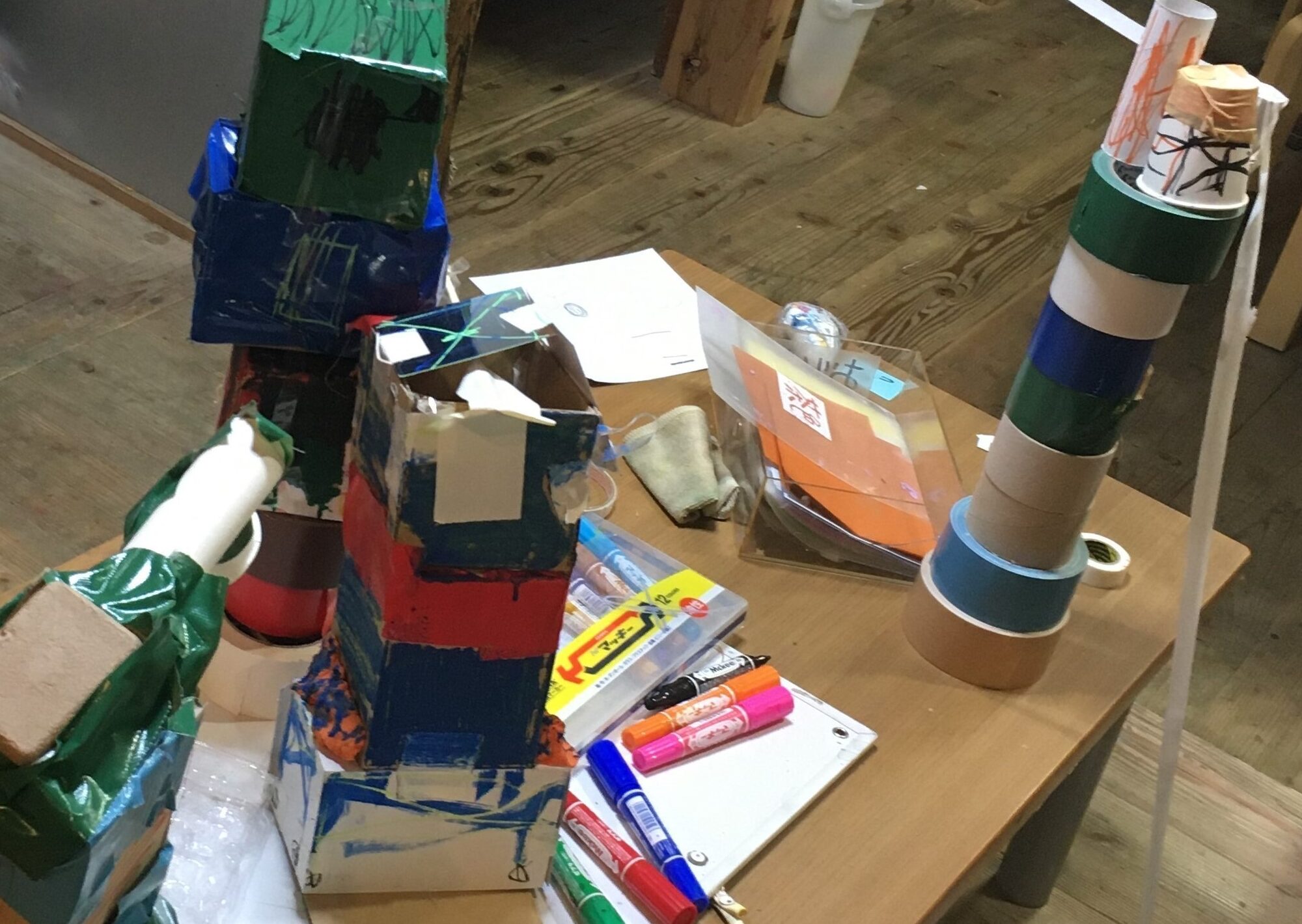 自由制作 まち 豊崎25ー4 自由制作 2025.04.192025.05.20 段ボールや紙コップで立体をつくる以外にも布テープを重ねたり、ペンを並べたり、ヒモを柱にくっつけたりして大好きなトーマスが走っている町なのかもしれません!