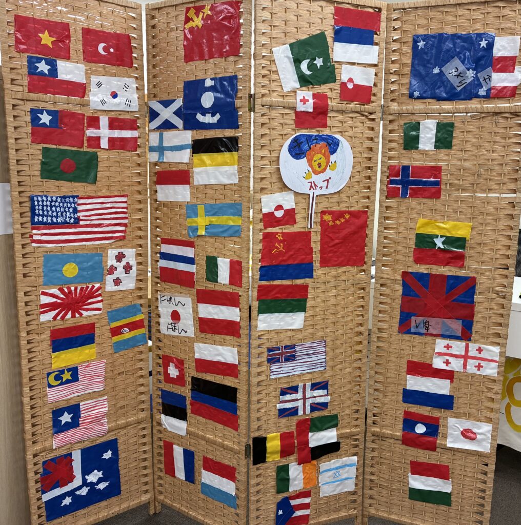 自由制作 国旗 こどもの現代アート 25-7 自由制作 2025.07.27 世界の国旗を布テープでどんどん作ってパーテーションに貼ってくれた作品です。あの国旗はどの国?知ってる!とほかのお友達もあてっこが楽しそうです。