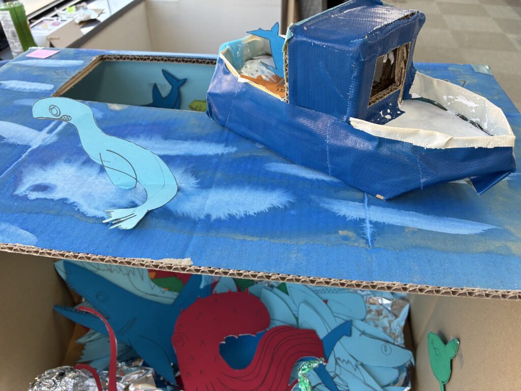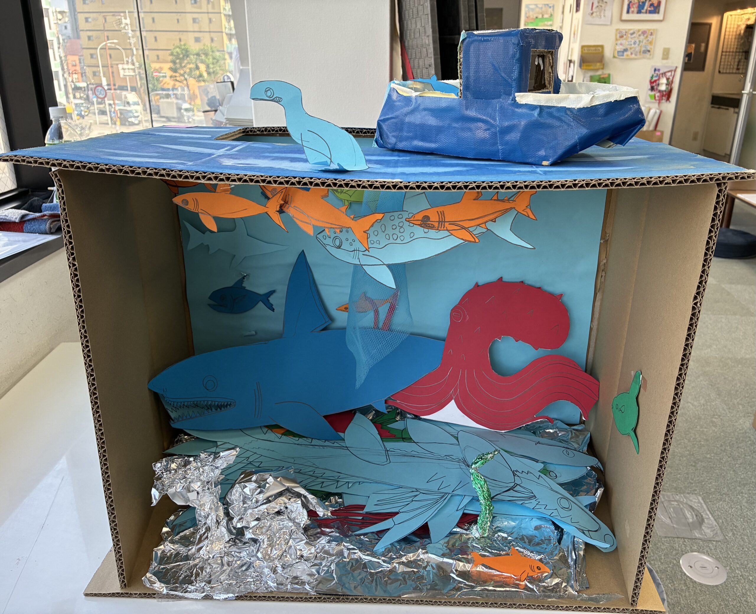 自由制作 海 芸術の未来塾 25-7 自由制作 2025.07.27 箱の中に海をつくっていたら海面と船へとイメージが広がって、お魚をとっている網まで出現しました!海底にはまだ設置を待っている魚たちがいっぱいいます。