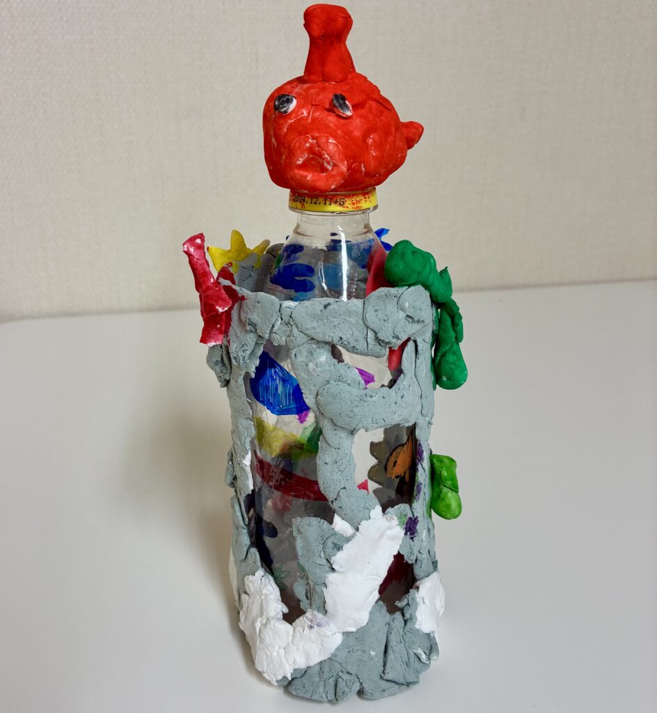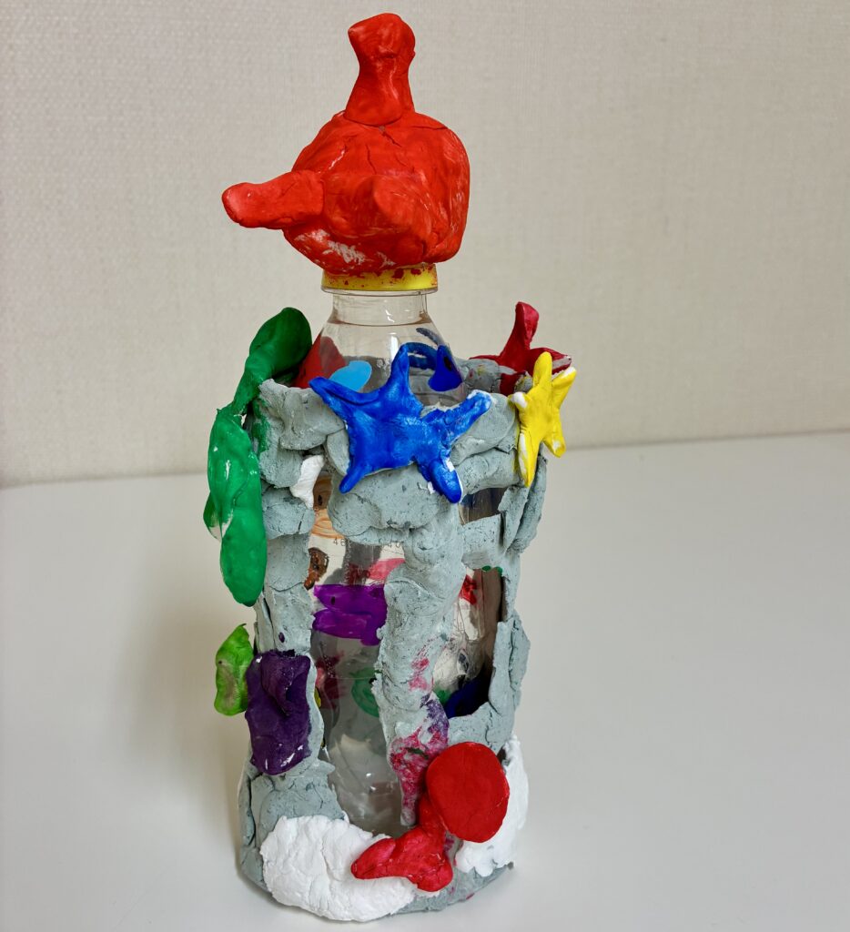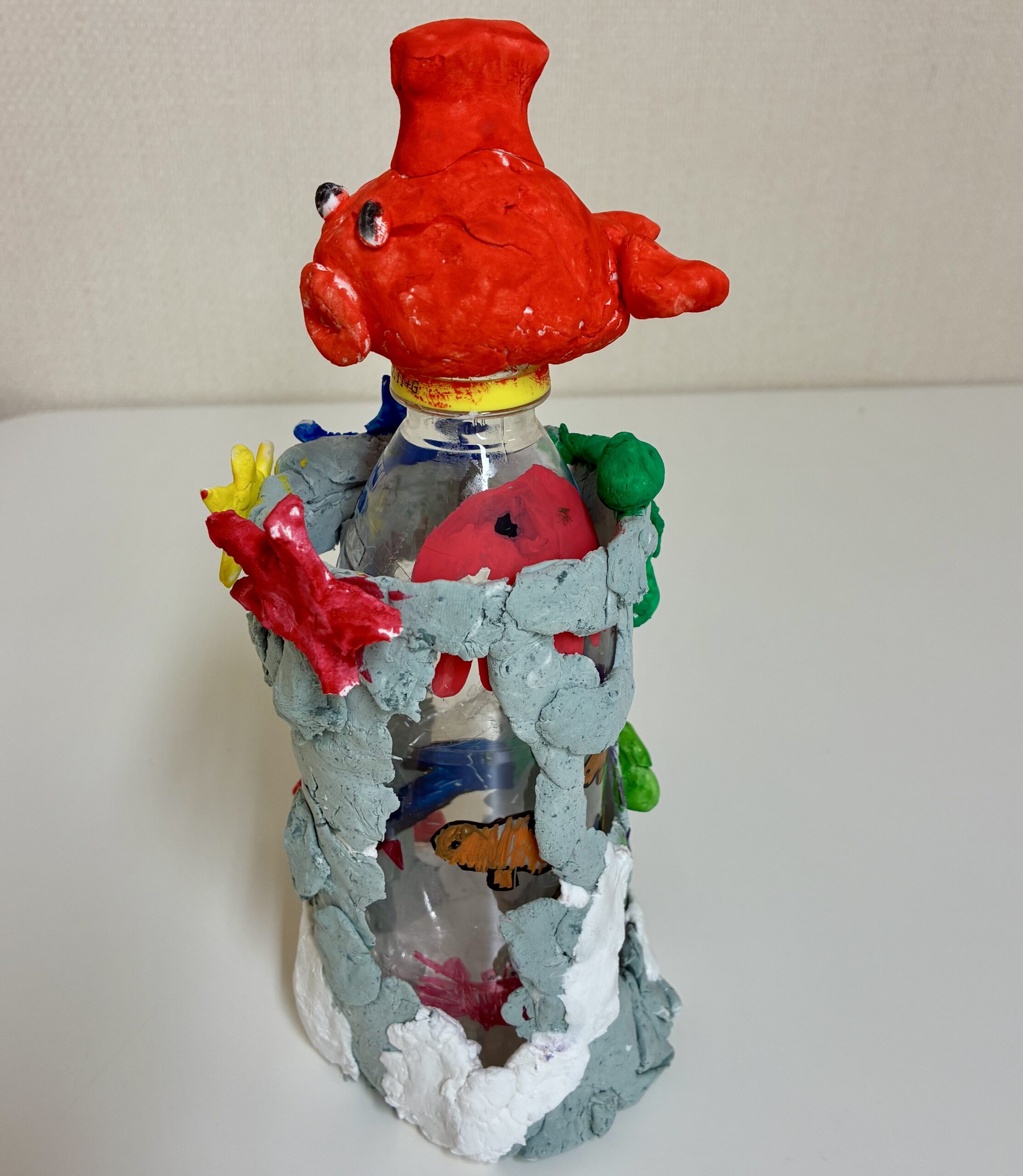 中のペットボトルをクルクル回すと景色が変わるアクアリウムです。どの方向から見てもいろんなものが登場して楽しい〜!タイの後ろ姿までかわいいです。
