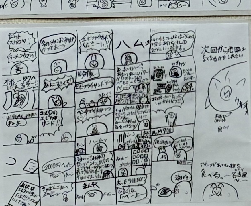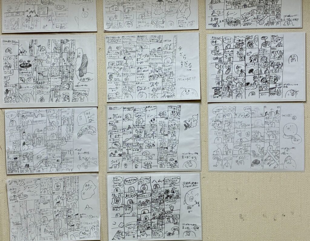 未分類45分の授業で1枚仕上げるまんが作品、完成するとコピーを壁に展示し続けてくれています。ユーモラスで、話もどんどん展開します!