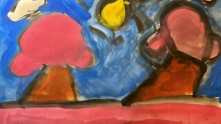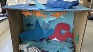 箱の中に海をつくっていたら海面と船へとイメージが広がって、お魚をとっている網まで出現しました!海底にはまだ設置を待っている魚たちがいっぱいいます。