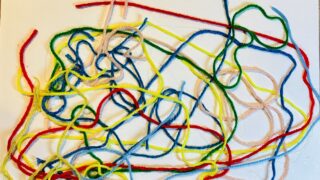 毛糸でつくる絵です。ボンドで画面いっぱいに自由な線をひいて、好きな色の毛糸を選んでのせていきます。毛糸が持っているやわらかい質感がのびのびと楽しそうです!